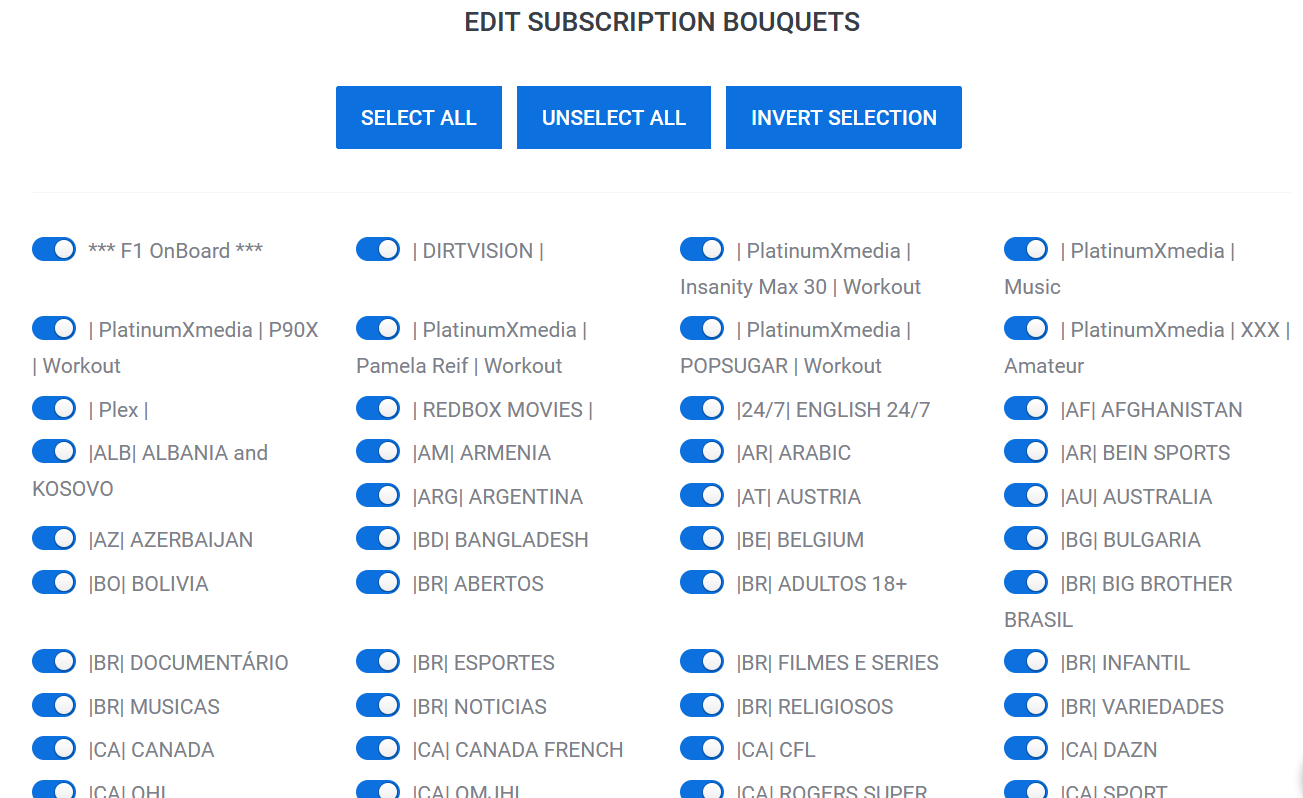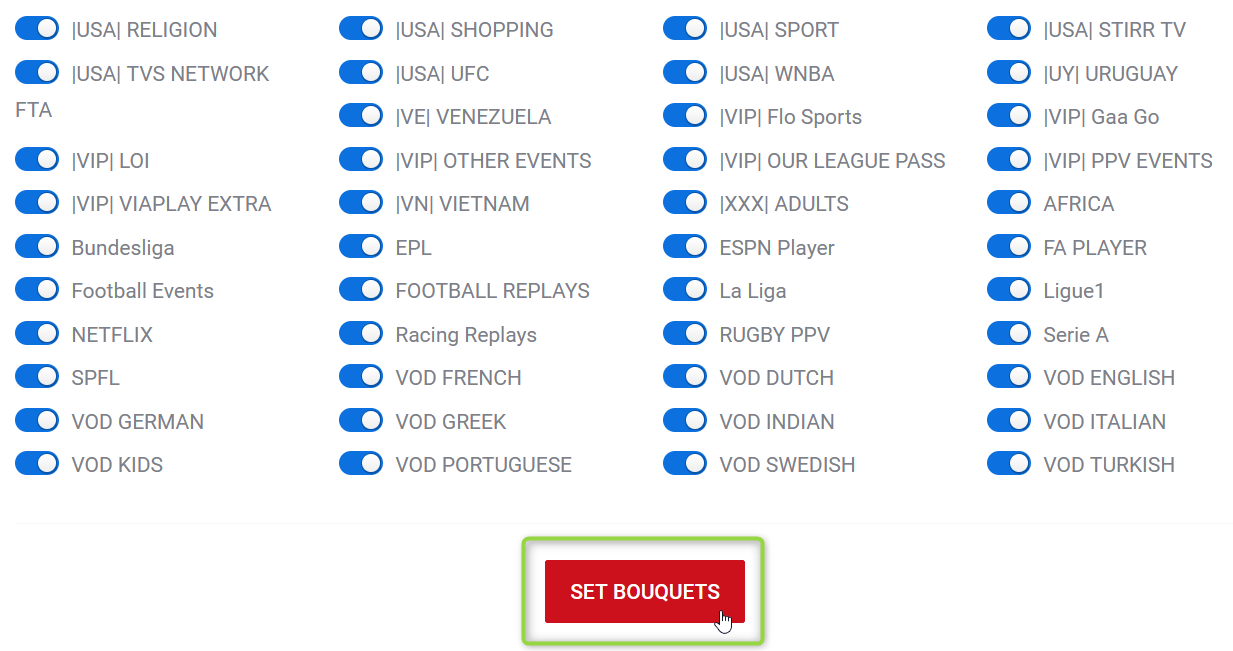 5. After selecting the desired bouquets, scroll to the bottom of the list and click SET BOUQUETS: